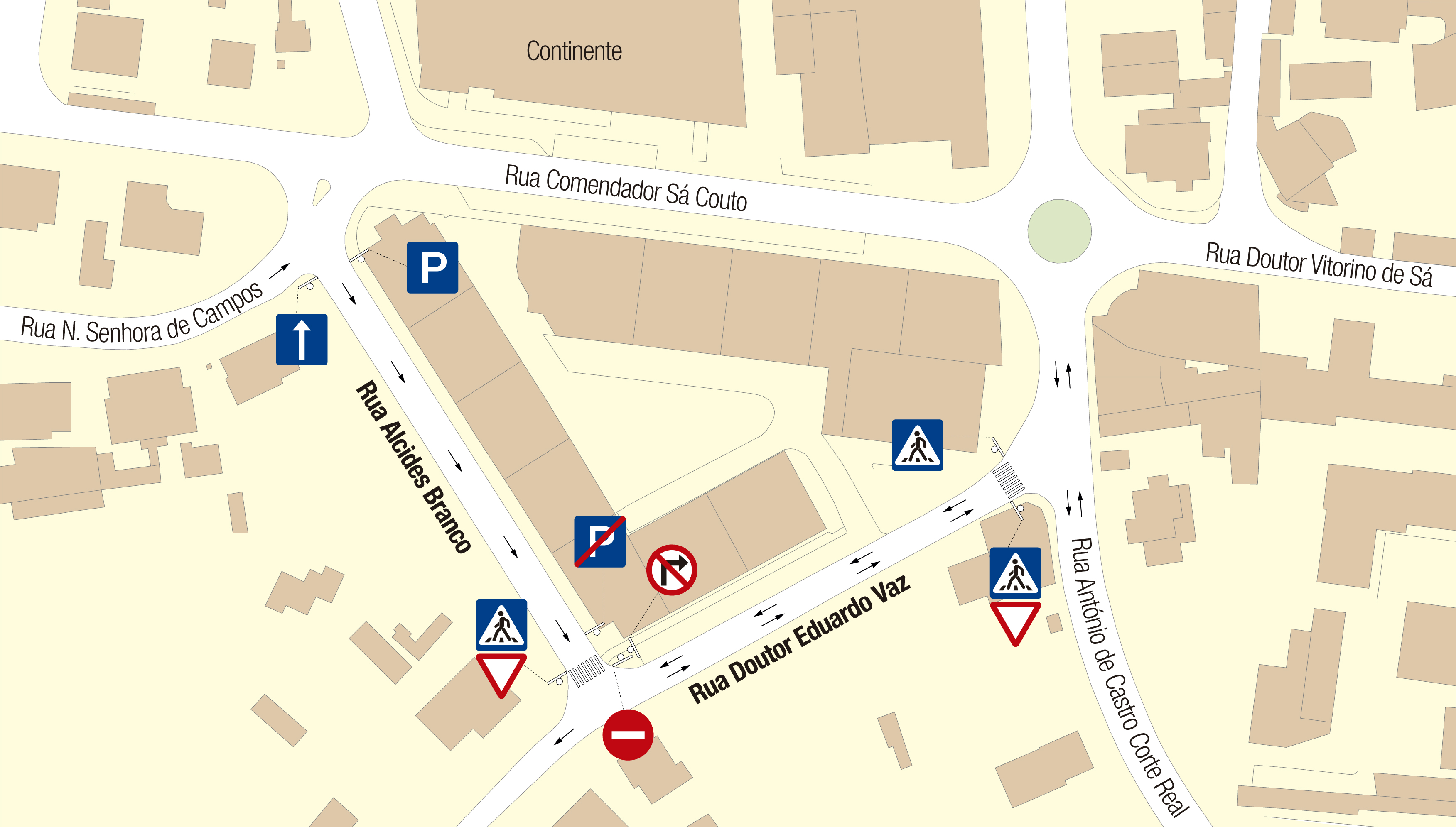 A Rua Alcides Branco, atualmente de sentido único (sul-norte) sofrerá uma inversão de sentido, passando o trânsito a fluir em sentido contrário. Já a Rua Doutor Eduardo Vaz, nomeadamente o troço compreendido entre a Rua António Castro Corte Real e a Rua Alcides Branco, atualmente de sentido único (nascente/poente) passará agora a contemplar trânsito nos dois sentidos de circulação.