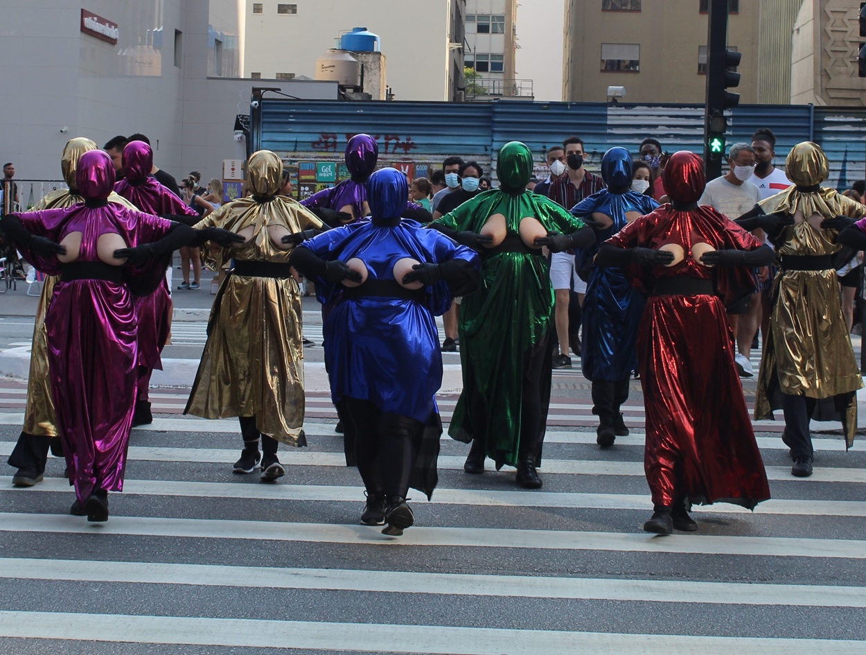 A performance MAMIL(a)S propõe-se questionar de forma poética leituras normativas da presença no espaço urbano, valorizando o coletivo como gesto de celebração e afirmação.