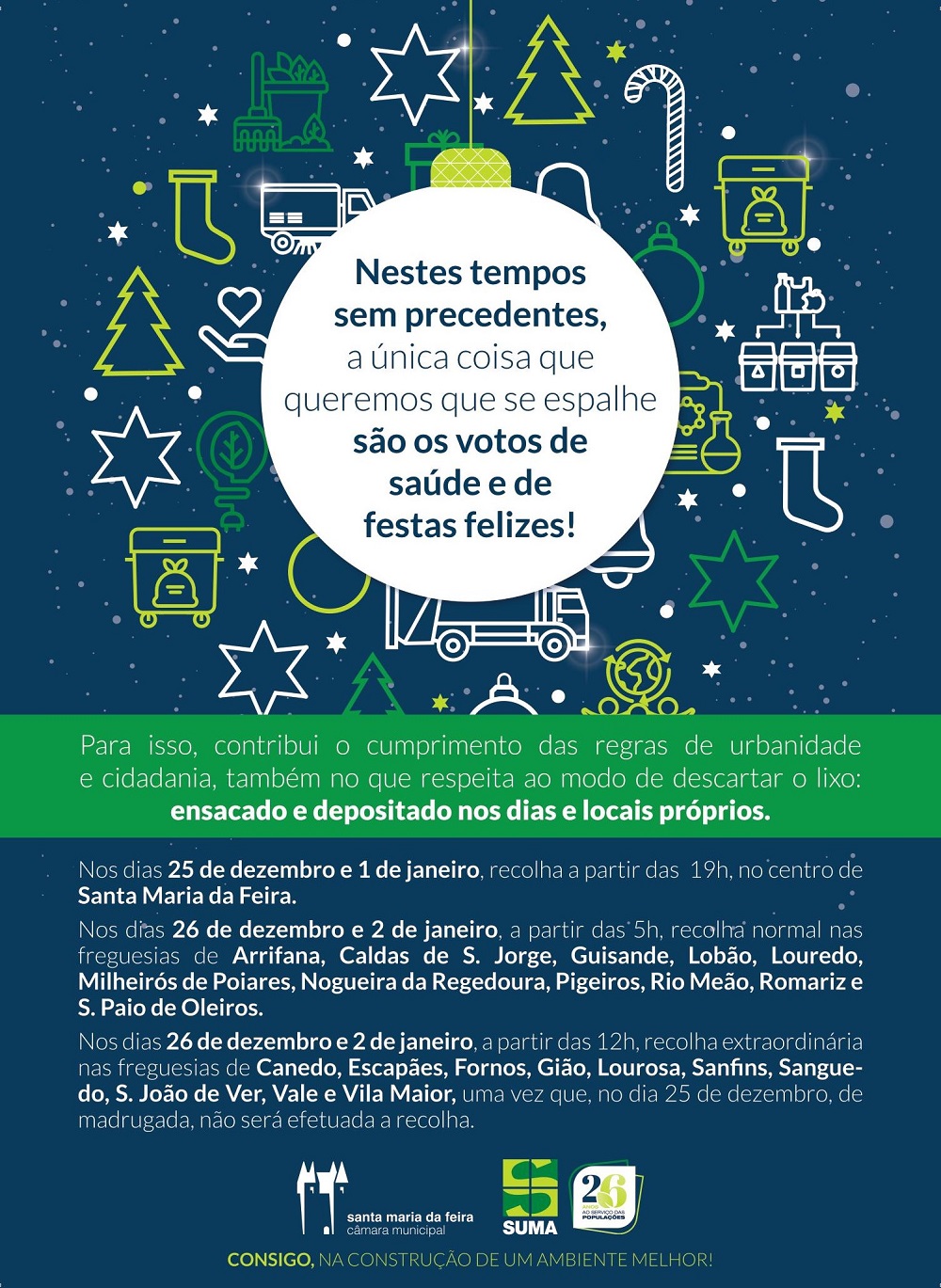 A Câmara Municipal de Santa Maria da Feira informa que, nos períodos do Natal e do Ano Novo, o serviço de recolha de resíduos urbanos será efetuado com alguns condicionamentos.