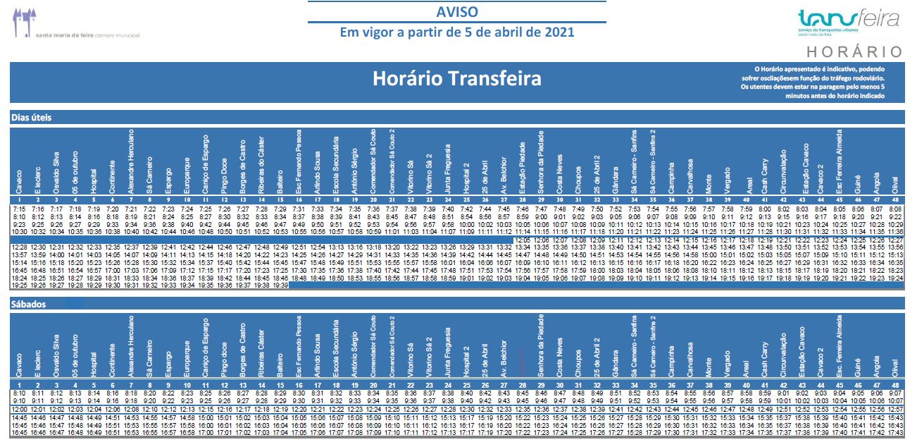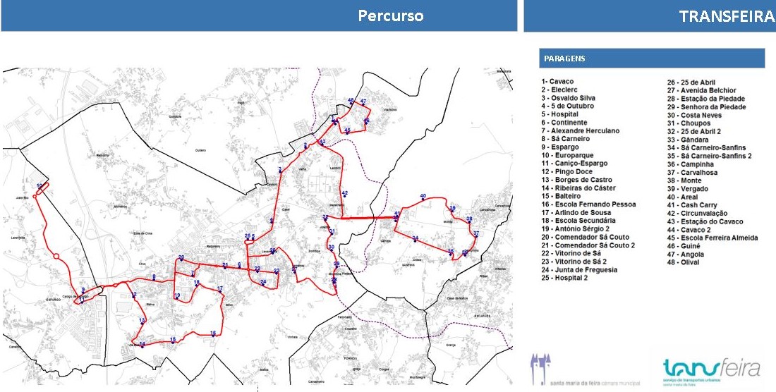 Todos os percursos e os horários do Transfeira estão disponíveis aqui. Para continuar a melhorar este serviço de transportes urbano, a Câmara Municipal de Santa Maria da Feira disponibiliza o email transportes.mobilidade@cm-feira.pt para onde devem ser enviadas sugestões.