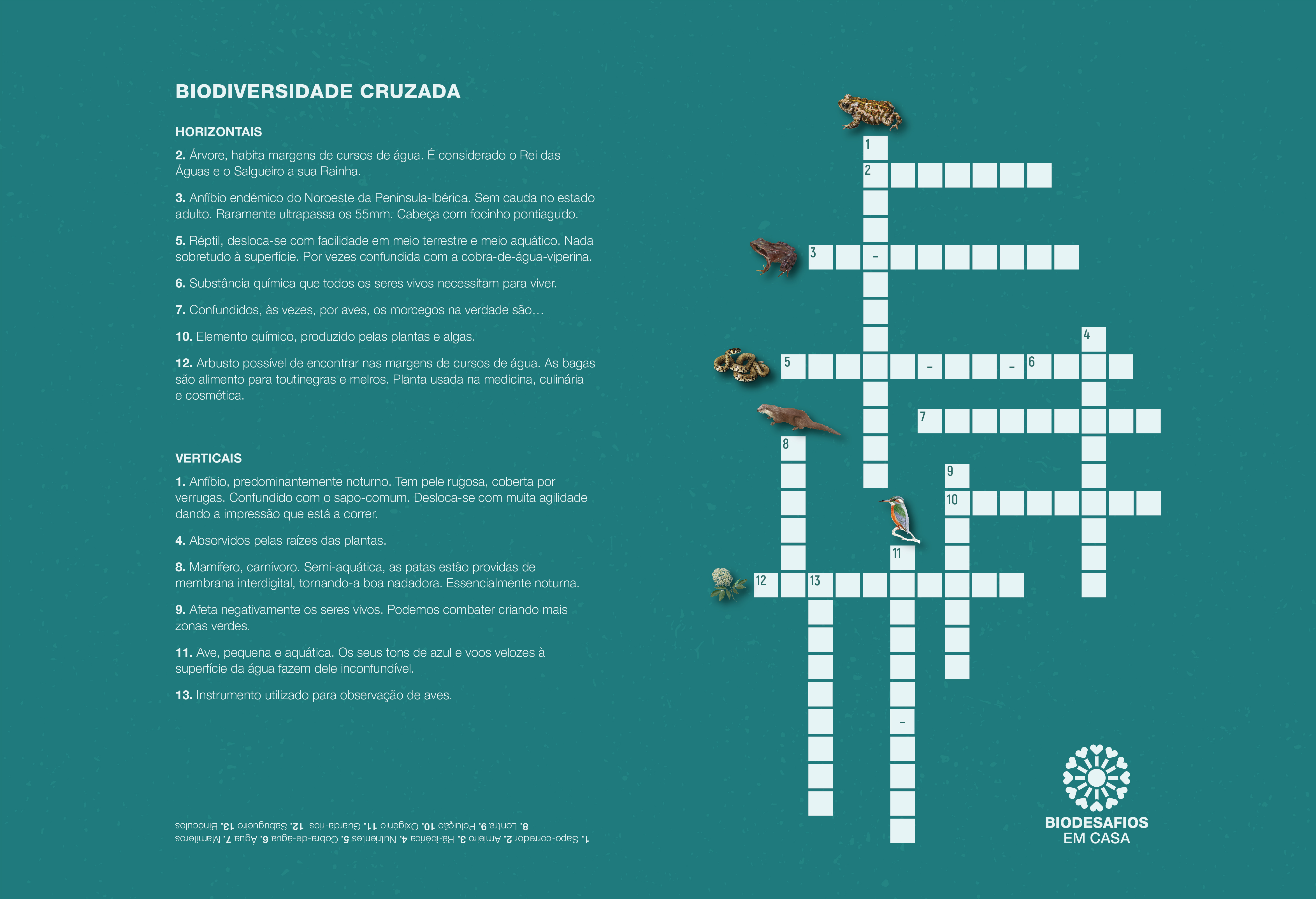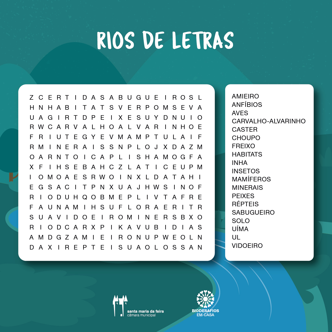 Neste rio de letras, trazemos algumas espécies de plantas, animais e outros intervenientes que são fundamentais para a existência deste ecossistema. Também os nossos rios estão presentes. Consegue encontrá-los?