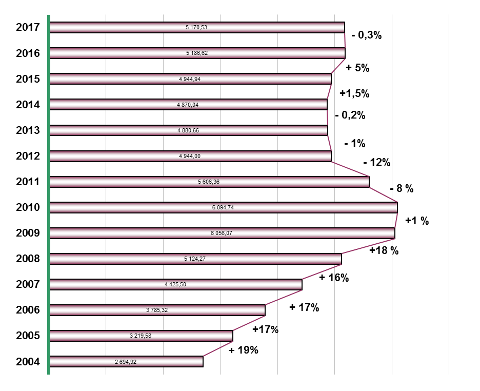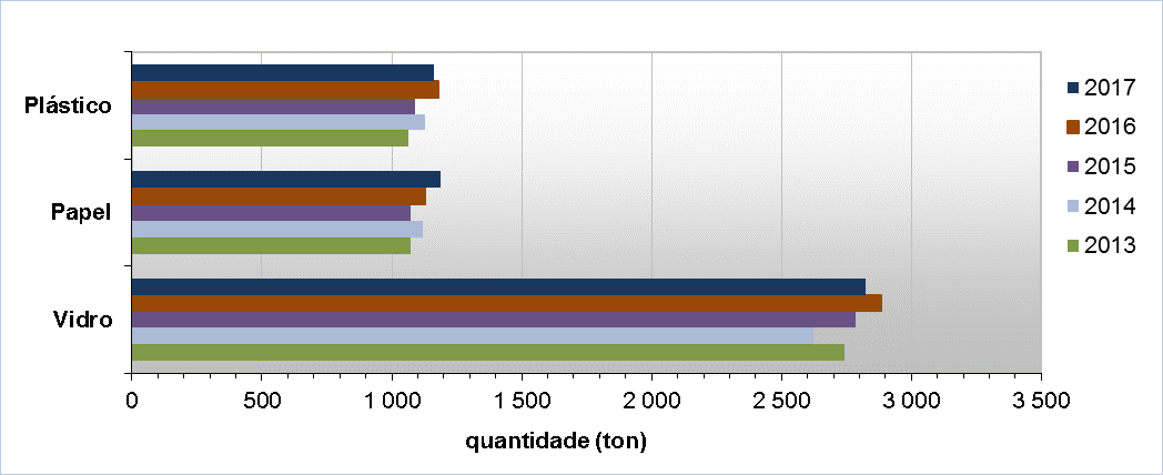 A quantidade de resíduos recicláveis atingiu, em 2017, o valor de 5.170 toneladas, que corresponde a um valor médio per capita de 37,11 Kg/hab/ano.